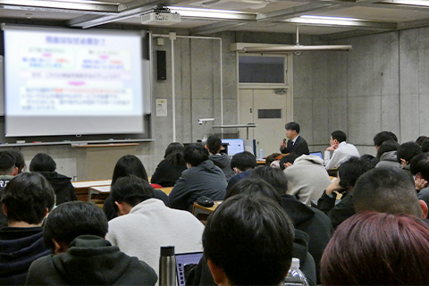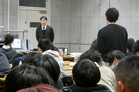 「教育者への道Ⅱ」(代表教員:松橋義樹准教授)の2025年12月10日の授業では、茨城県笠間市にある成田一敏税理士事務所の成田一敏氏をゲストスピーカーとしてお招きし、学校現場で行われている租税教室を再現していただくとともに、学生からの質問にお答えいただきました。