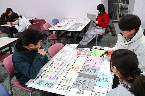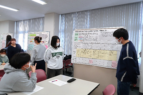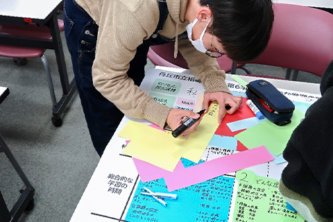 たとえば、主に2~3年生が履修する「総合的な学習の時間の指導法」(担当:石﨑友規准教授、芦沢柚香助教)の授業では、年間指導計画をグループごとに考える内容を展開しています。