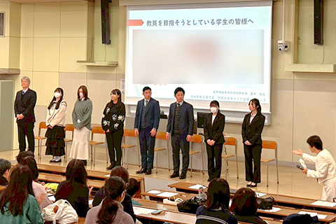 教員免許取得を目指す学生が多い本学科では、教育現場への就職という専門性の高い進路だからこそ、特有の悩みや不安を抱えることも少なくありません。そこで例年、進路選択の重要な時期を迎える2・3年生を対象に、学科独自のキャリア支援として「OB・OGによるキャリアセミナー」を開催しています。