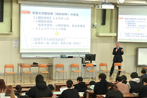 今年度の第1部では、本学科の前身である人間関係学科の卒業生で、校長職などを歴任された廣木恒夫先生が登壇。「子どもとの繋がりは卒業後も続く」という教職の尊さや、管理職としての視点、学校種を越えた人事交流の仕組みなど、教育現場で長く歩んでいくための指針が示されました。