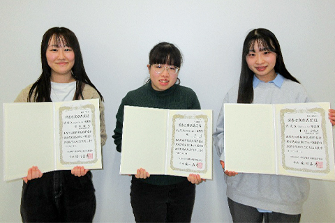 令和6年12月に実施された「栄養士実力認定試験」において、健康栄養学科 現在4年(当時3年)の柴美咲さんが成績優秀者、木内ひなたさん、清水綾乃さんが成績優良者として表彰されました。