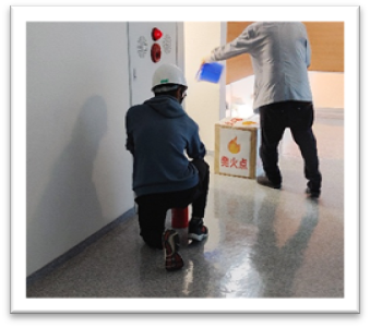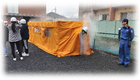 その後、消防士の指導のもと、水消火器を使用した消火訓練と煙体験を行いました。当日立ち会っていただいた水戸北消防署の隊員からの講評では、日ごろから火災等が発生したときにどのように行動するかを意識して生活することの大切さが伝えられました。入居する学生一人一人の防災に対する意識を高める事ができました。