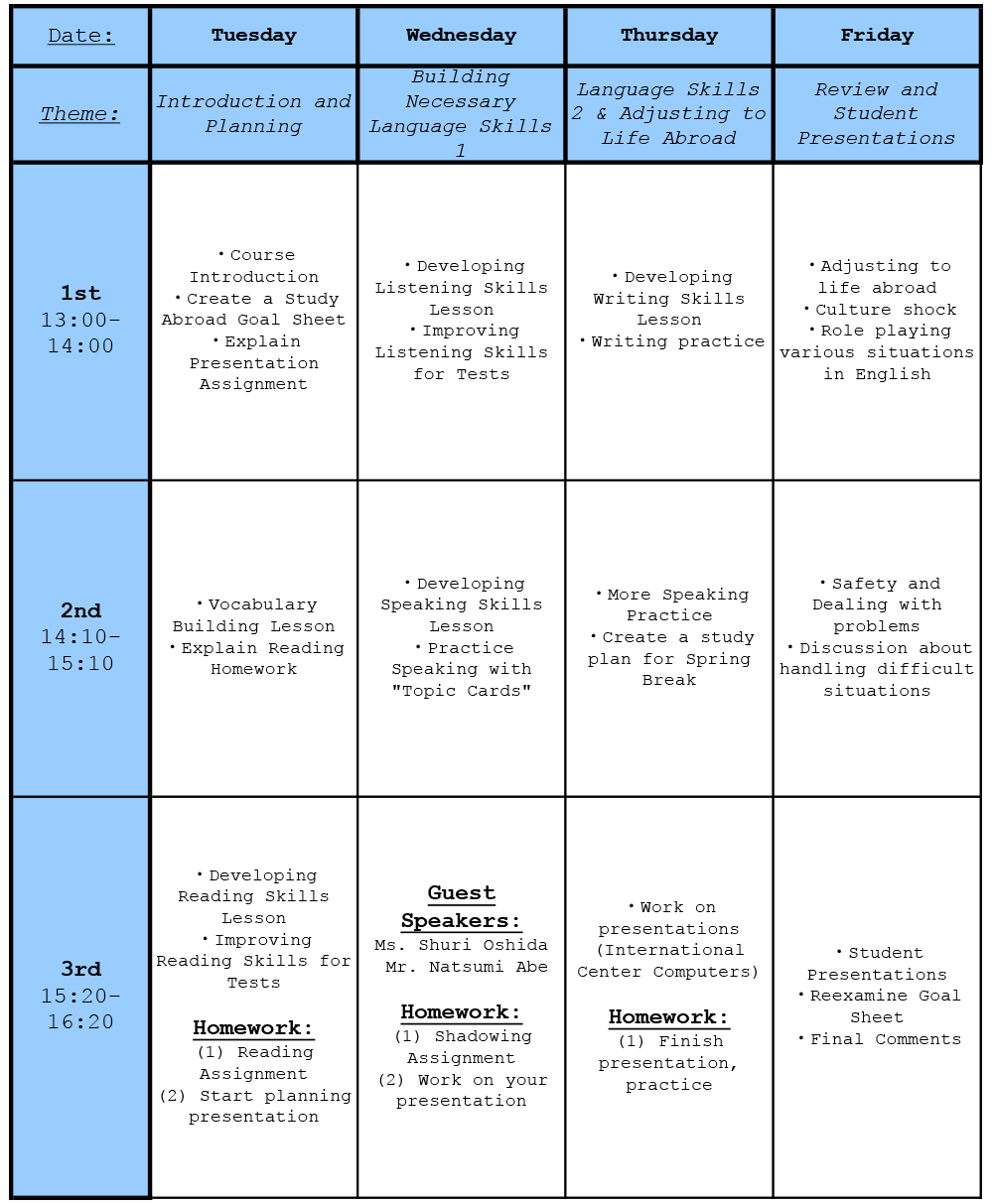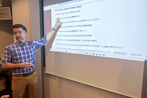 留学を実現するには、早い時期から、語学学習に計画的・戦略的に取り組むことが必要です。「留学準備・英語対策講座」では、留学に必要な英語力を効果的に伸ばす学習方法が学べます。留学を実現した先輩たちからも、留学体験や語学の学習方法を直接聞く機会も設けます。