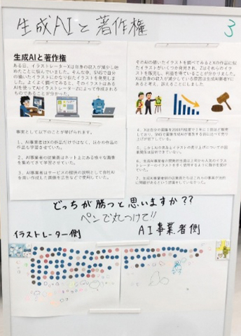 橋爪ゼミでは、「デジタル社会のリスク検定」と称して、インターネット空間で問題となるネット・リテラシーの問題(アテンション・エコノミーやフィルター・バブル)、著作権の扱い、近年急速に発展している生成AIをテーマとした展示を行い、来場者の皆様に最新の法的課題について体感していただきながら、分かりやすく紹介いたしました。一例としてはAIで生成した画像と実在する画像を見極めるクイズを出題いたしました(正答率は30%程度)。これらのテーマは先端性のある重要な問題であり、2026年度から開講される「法律行政学特論」で扱われる予定です。