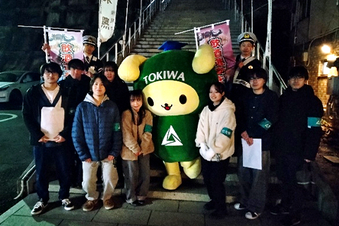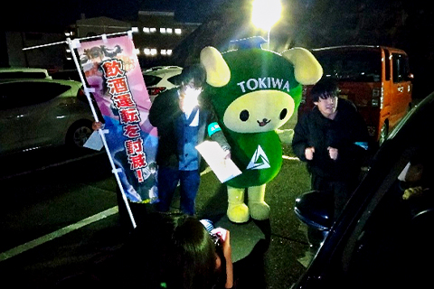 当日は、本学TOKIWAマスコットキャラクター「ときわんこ」も参加し、親しみやすい雰囲気づくりに貢献。学生たちはコインパーキングを利用するドライバー一人ひとりに声をかけ、チラシの配布とアンケート調査への協力を呼びかけました。