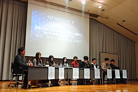報告会では、進路を決め、活動を開始した時期、具体的な試験内容と対策、授業やゼミナールとの両立、「ガクチカ」、就職活動でつらかったことなどについて語っていただきました。一部の登壇者については、すでに学科ニュースにてインタビューが掲載されていますので、合わせてご覧ください。
