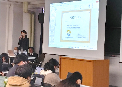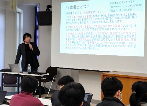 司法書士・行政書士ともに合格率10%前後の難関資格であり、合格後も研修を通じて学び続ける姿勢が必要であることが紹介されました。学生たちは、専門職として社会を支える責任とやりがいについて理解を深めました。
