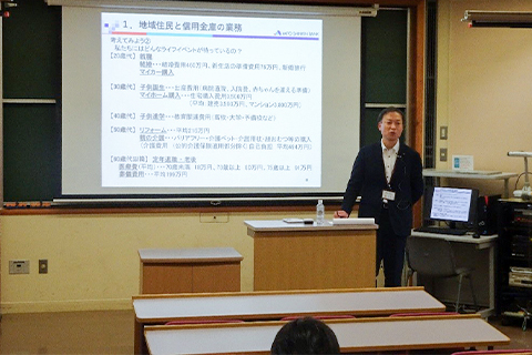 2025年10月16日に、経営学科の専攻科目である「地域金融システム論」にて水戸信用金庫 営業統括部 主任調査役の石田直樹氏をお招きし、特別講義をしていただきました。