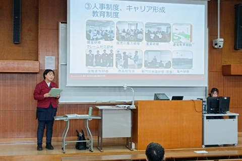 2025年10月23日(木)に、3年生の必修科目である「キャリア開発論」にて株式会社山新 総務部主任の早田恵美氏をお招きし、山新の事業内容、組織編制、人事制度などについてご講義していただきました。