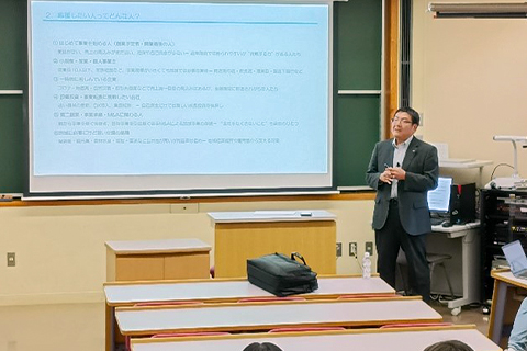 2025年10月30日(木)に、経営学科の専攻科目である「地域金融システム論」にて水戸信用金庫 経営支援部 主任調査役の田所信幸氏をお招きし、特別講義をしていただきました。