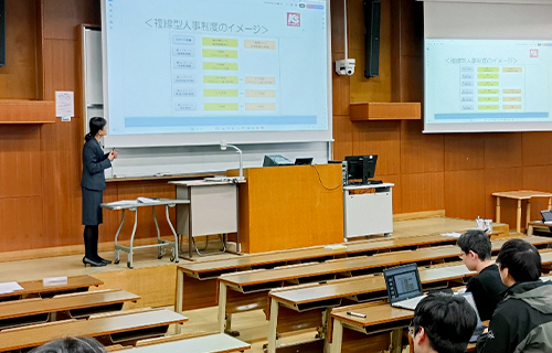 2025年12月11日に、3年生の必修科目である「キャリア開発論」にて株式会社ケーズホールディングス 執行役員・管理本部人材開発部部長代理の佐藤京子氏をお招きし、ご講義いただきました。