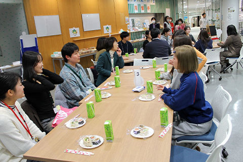 皆さん 疲れも見せず、積極的に日本語や英語で交流しています。韓国の学生さんは国際交流会館に宿泊、寮生と買い物に出かけたり、語り合ったりして、深夜まで交流していたそうです。