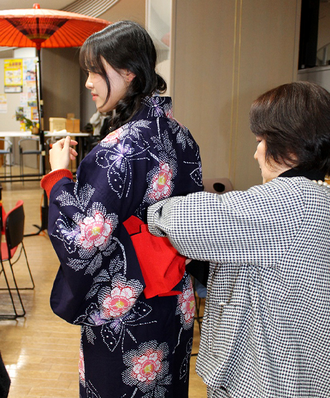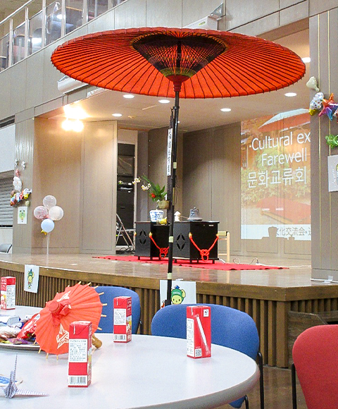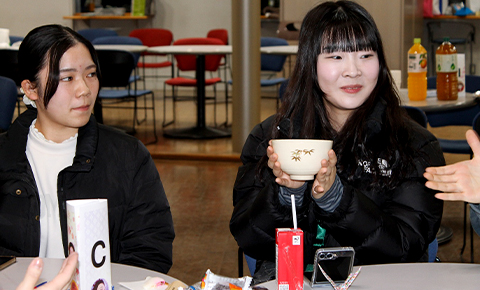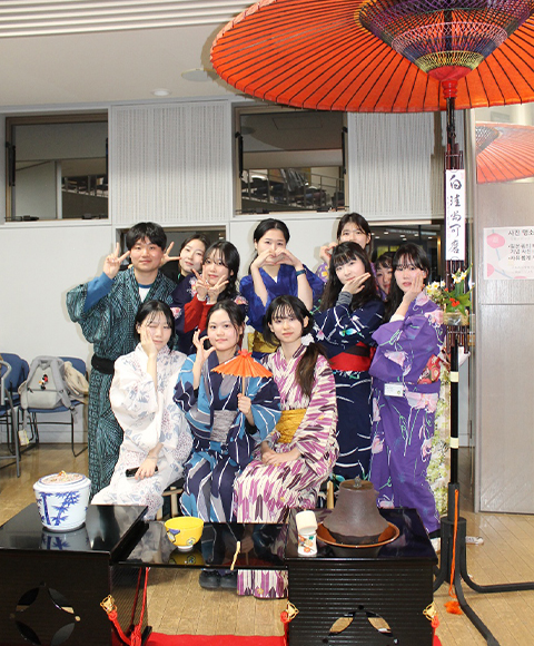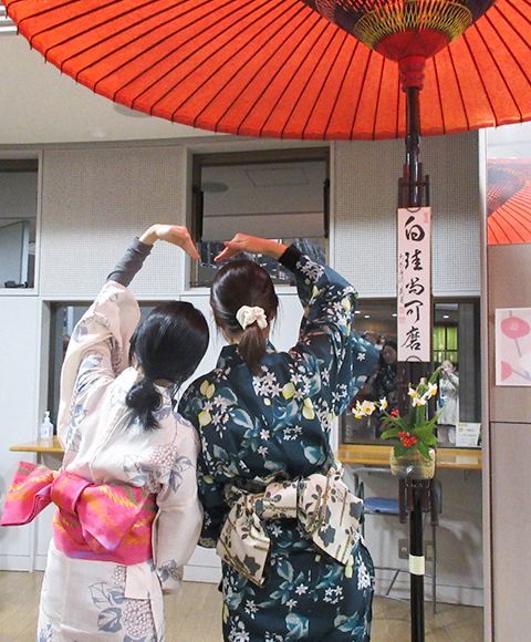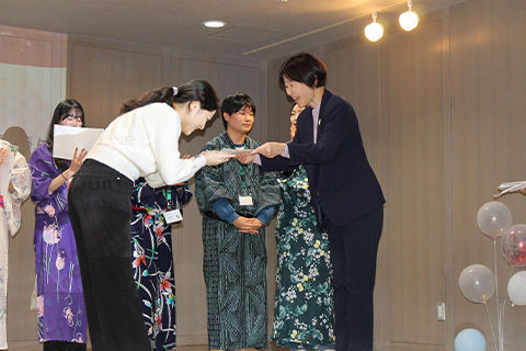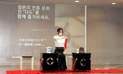 1月15日、学術交流会の後、最後のイベントになる文化交流会と送別会をT棟で開催しました。茶道部の協力でお点前をご披露くださりました。DCU学生は浴衣を着て、日本の雰囲気を味わいながら過ごしました。DCU企画では、参加者の幸せを願った「福」(お守り)のアクセサリー作りがありました。そして、本学教員のフィットネスGOLDENと4年生ダンス部のGOLDENにより、会場は大盛り上がりです。DCU学生から3日間の振り返りの写真報告がありました。
