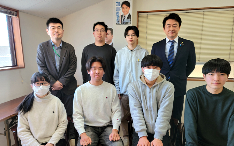 2025年12月22日(月)、総合政策学部総合政策学科の竹内ゼミナールの2年生6名が、加藤明良参議院議員を水戸市柳町の事務所に表敬しました。