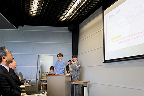 A班(江連羽乙さん、黒羽智哉さん、武田竜馬さん、西村凉さん、村山大翔さん)は、「水戸ホーリーホックを核とした観光政策~他自治体の実証データに基づく分析」と題し、J1に昇格した水戸ホーリーホックが活動拠点を笠松運動公園に移した場合でも、市内商業施設との連携や水戸駅からスタジアムへの直行バスの運行などにより、市内への経済波及効果を高めることが可能であると説明しました。あわせて、水戸駅前広場でのパブリックビューイングや臨時屋台の設置などを通じて、水戸市全体を「第二のスタジアム」として位置づけるアイデアを提案しました。